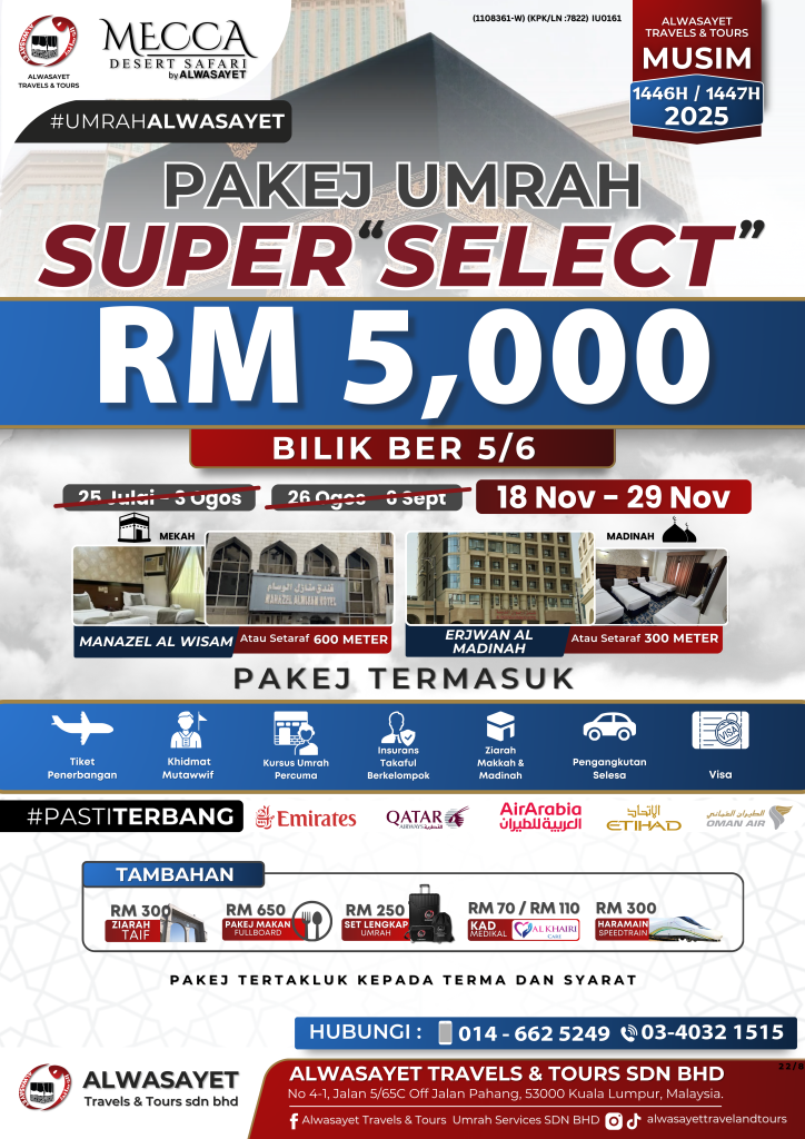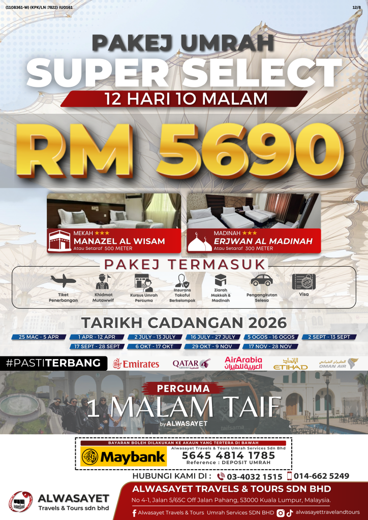 Pakej SUPERSELECT adalah pakej Umrah 2026 dengan harga yang minima. Pakej ini bersesuaian bagi semua jemaah kerana jarak hotel di Mekah di antara 500 meter – 600 meter dari Masjidil Haram. Walaupun dengan harga yang minima tetapi program yang disusun adalah sama dengan pakej-pakej kami yang lain. Minimum untuk 30 jemaah. Pakej ini juga termasuk dengan percuma 1 Malam di TAIF